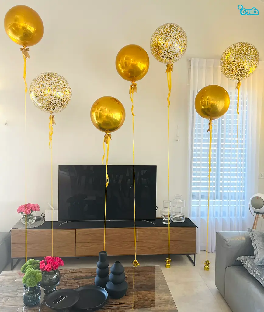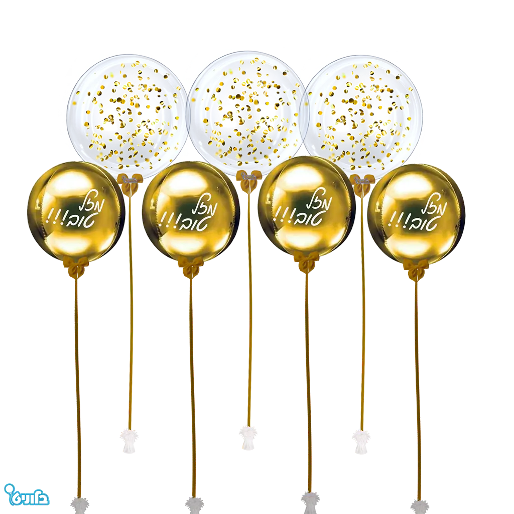 • 4 בלוני כרום זהב – עגולים, אלגנטיים, עם כיתוב “מזל טוב!!!”