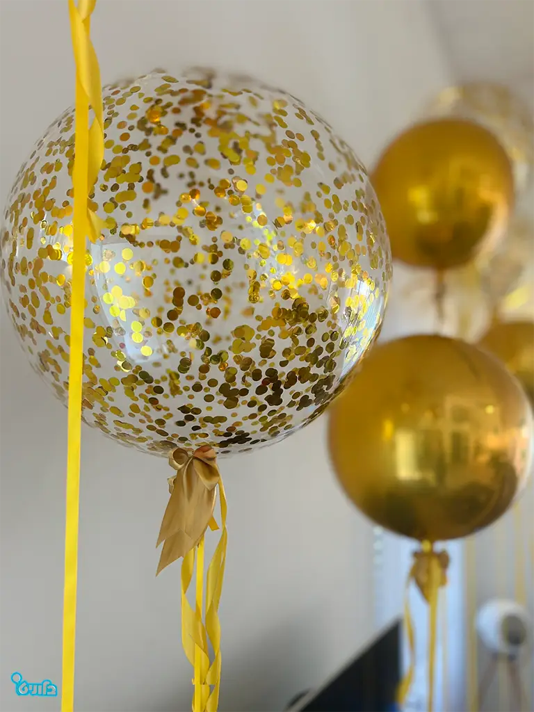 • 3 בלוני בועה שקופים – עם קונפטי זהוב פנימי